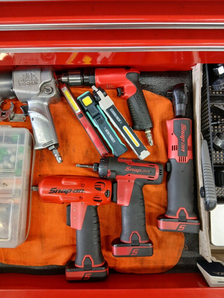 ▲私の工具箱の引き出し。真っ赤なSnap-onの電動工具の中に、アストロのライトが自然に混ざっています。これが「実用性」を追求した結果です。